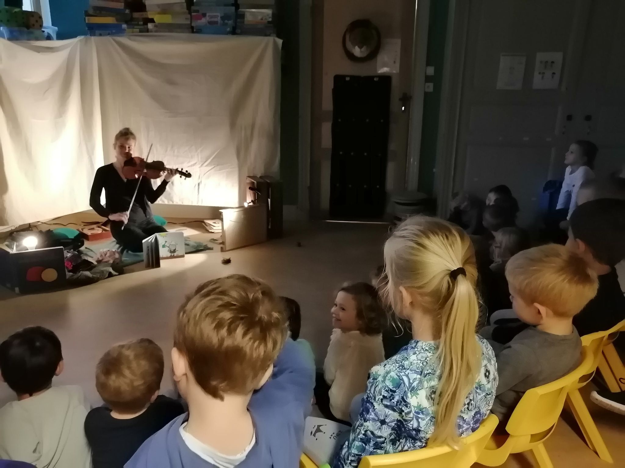 Anaïs Lambert est venue rendre visite aux enfants de maternelle. Elle nous a fait découvrir l’univers sonore des histoires, au son des cordes du violon, du sansula et autres curieux instruments.